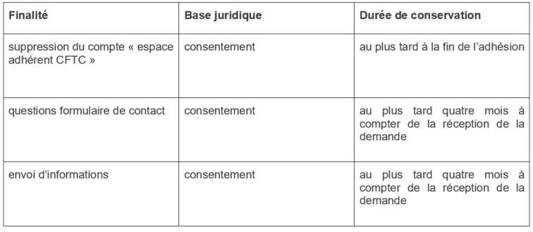 Conservation du formulaire d’inscription en base de données portail : 1 an Transfert du dossier d’adhésion à la structure CFTC qui pourra prendre en charge l’adhésion dans l’attente d’affectation au syndicat d’affiliation. Conservation des informations nominatives le temps de l’adhésion, archivage intermédiaire 1 an puis suppression définitive après la perte de la qualité d’adhérent – dans la limite de 5 ans |